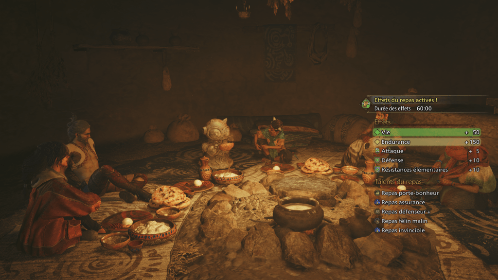 Parfois, les habitants des villages des Terres Interdites peuvent vous convier à un festin. Ce repas luxueux pousse le bonus de repas à 90 minutes, vous offre de meilleurs bonus généraux et vous offrent un talent garanti unique à chaque village en plus de Repas assureur et de la version forte de l’ingrédient de leur village (par exemple Repas défenseur + à Kunafa). Leurs effets sont en général liés aux récompenses de quête.