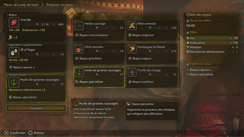 Vous pouvez ensuite choisir entre la viande pour augmenter votre attaque, le poisson pour votre défense ou les légumes pour les résistances élémentaires. Il est possible de préparer un repas avec exclusivement les rations, ce dernier n’ayant alors que 50 minutes d’effet.