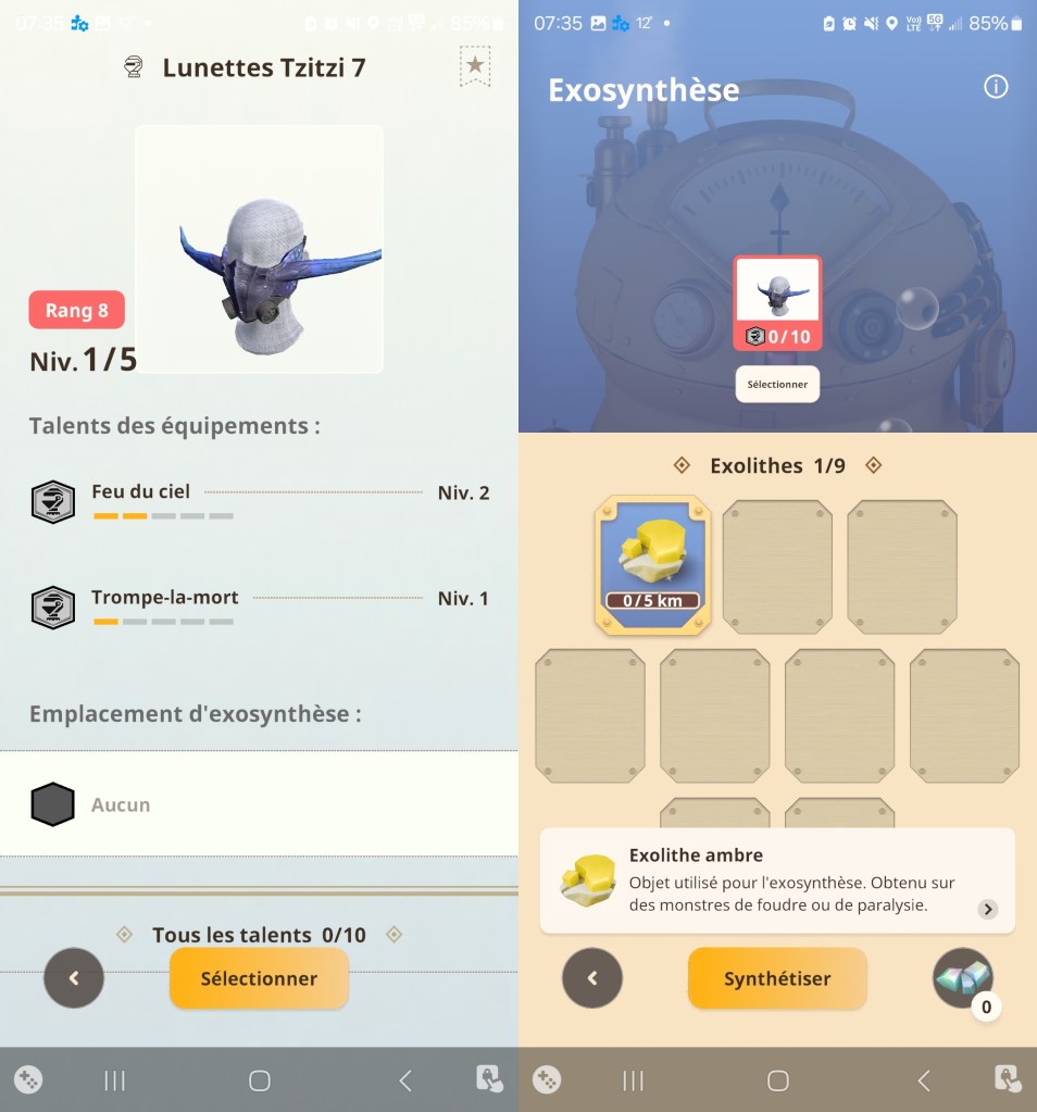En pressant le bouton en bas à droite de vos équipements, vous accédez au menu des exolithes où vous pouvez choisir une exolithe puis une pièce d’armure à laquelle l’assigner.