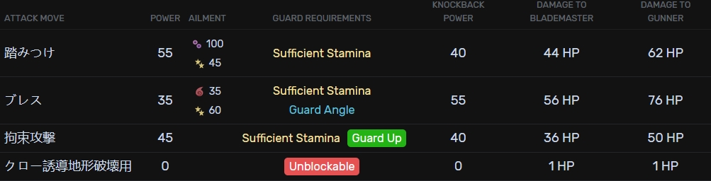 Outre le nom en japonais, on voit des dégâts aux joueurs selon qu’ils usent d’une arme épéiste ou artilleur, expliquant pourquoi les artilleurs subissent en général plus de dégâts en échange du confort de la distance, un statut parfois, incluant des dégâts d’assommement et/ou d’affliction (ici fléau-feu ou poison), un power, déterminant à quel point votre chasseur est repoussé (petit flinch, tombé sur les fesses, projection, etc) mais aussi une puissance de recul (knockback power) et des pré-requis de garde.