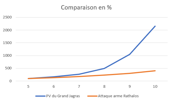 Meta means ‘Most Efficient Tactics Available’, aka in MHNow environment, how to clear the combat faster. And it’s important in that game since you have a tighter chrono to respect during the fight and monster’s HP increase a lot in endgame. To demonstrate my words, you can see below a comparison between a Great Jagras HP and a Rathalos weapon attack rank after rank, with the basis that rank 5 is 100% for both.