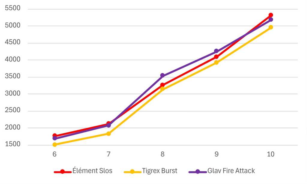 We can see here that if in the end element stays the strongest, Critical Ferocity stays really close (the Glavenus weapon even overpowering on certain ranks) and more importantly that the Tigrex weapon, despite being a raw weapon, is never far behind. At rank 10, it only has 7% less damage than the element option (while being 33% more powerful than a release elemental set). Tigrex weapons under Crit Ferocity are some form of anomaly in the MHNow meta landscape, weaker than the elemental meta but still strong enough to perform well against most of the roster.